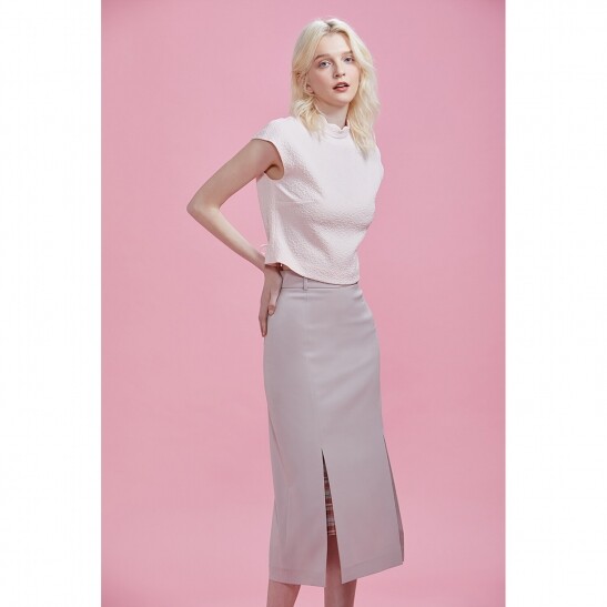 • 스커트 트임 사이로 보이는 체크 패턴이 유니크한 느낌을 더해주는 슬릿 세미 하이웨스트 스커트