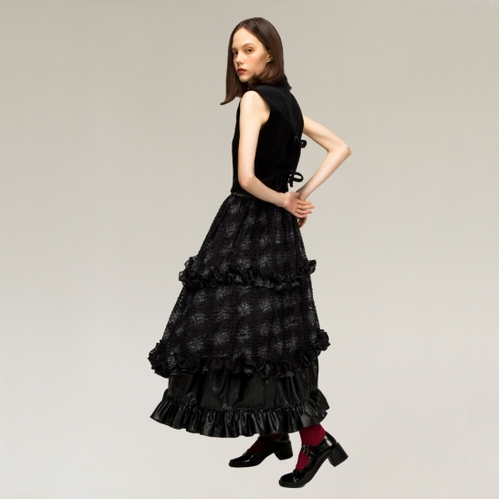 • 인조 가죽 스커트와 은은한 시스루 느낌의 레이어드 스커트로 레이어드 된 러플 스커트