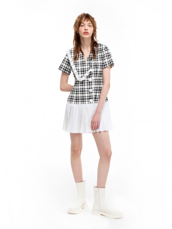 • 언밸런스 카라 디자인의 드레스로 스포티하면서 유니크한 프레피룩 스타일의 플리츠 드레스
