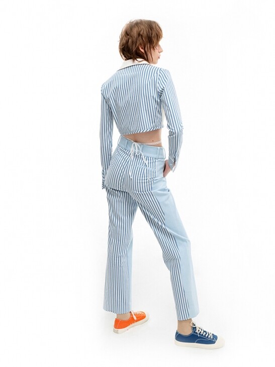 • 하이웨스트 디자인의 스트라이프 팬츠로 키치하면서도 유니크한 루즈핏 데님 팬츠