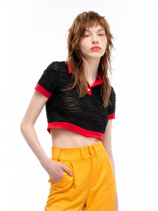 • 물결 라인과 레드 칼라가 포인트 배색으로 디자인된 은은한 시스루 느낌의 크롭 피케 셔츠